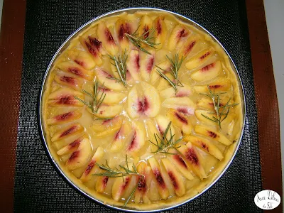 Les branchettes de romarin vont parfumer agréablement cette tarte fine...pêche, amande et romarin = une harmonie imparable!